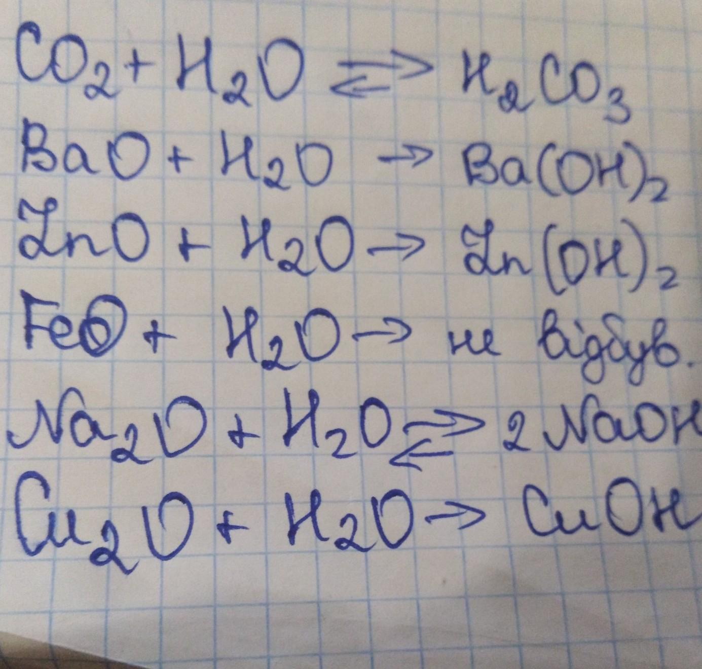 Укажіть, які з наведених оксидів - CO2, BaО, ZnO, FeО, Na2О, Cu2О - реагують з