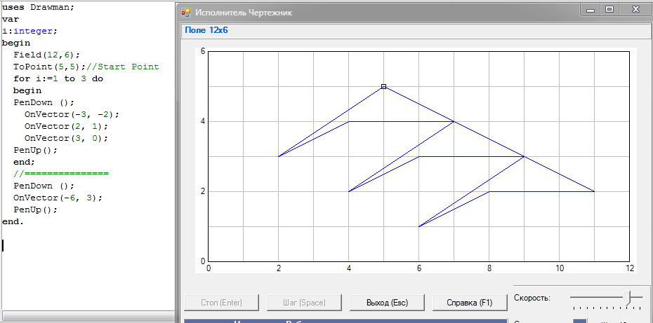 Например, если Чертёжник находится в точке с координатами (4, 2), то команда Сместиться на (2, –3) переместит Чертёжника в точку (6, –1).