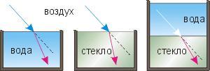 Ход светового луча из воздуха в стекло, из воды в воздух.