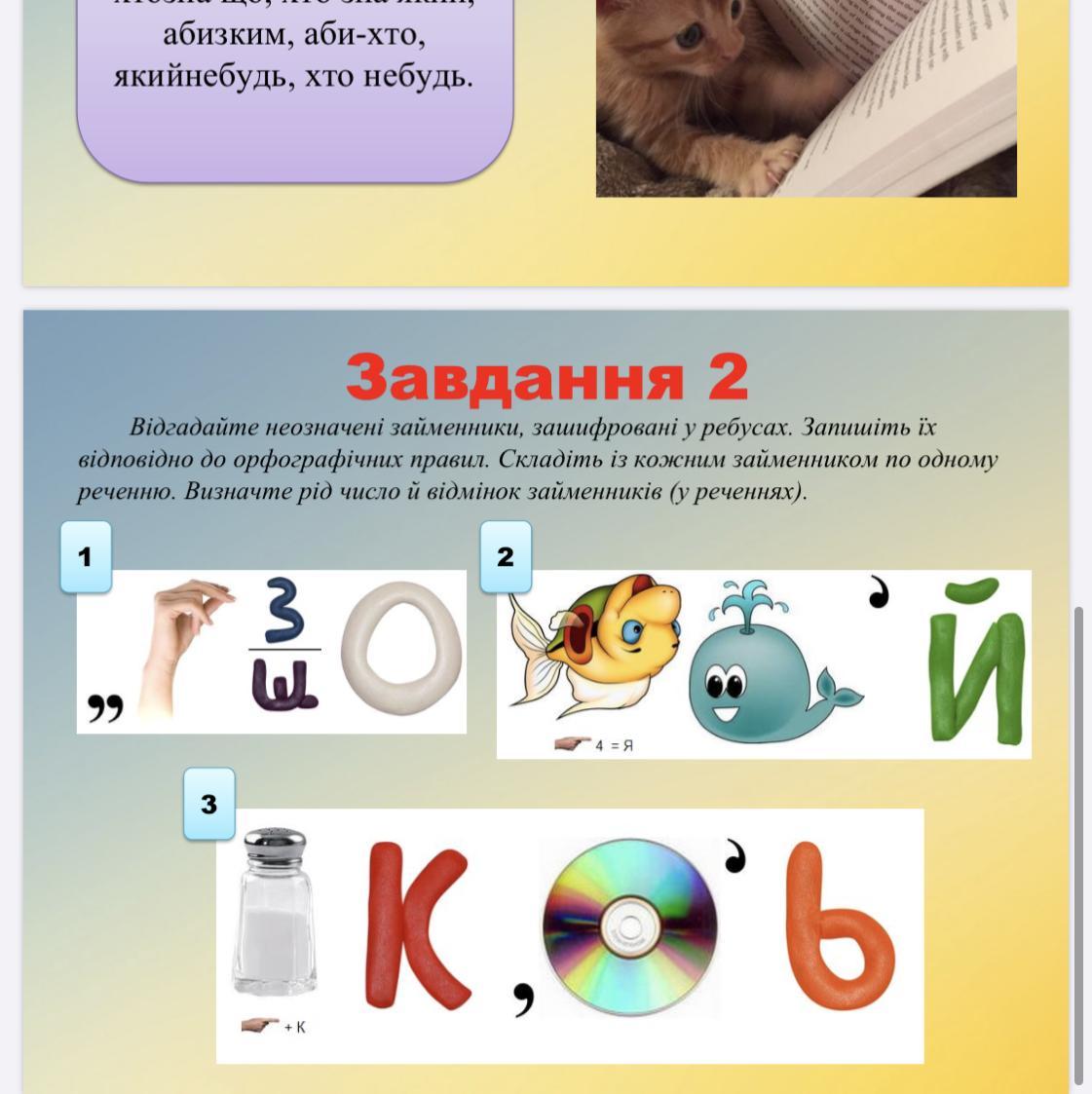 Відгадайте неозначені займенники, зашифровані у ребусах. Запишіть їх відповідно до орфографічних правил. Складіть із кожним займенником по одному реченню. Визначте рід число й відмінок займенників (у реченнях).
