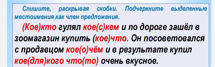 Кое-кто гулял кое с кем и по дороге зашёл в зоомагазин купить кое-что. Он посоветовался с продавцом кое о чём и в результате купил кое для кого что-то очень вкусное.