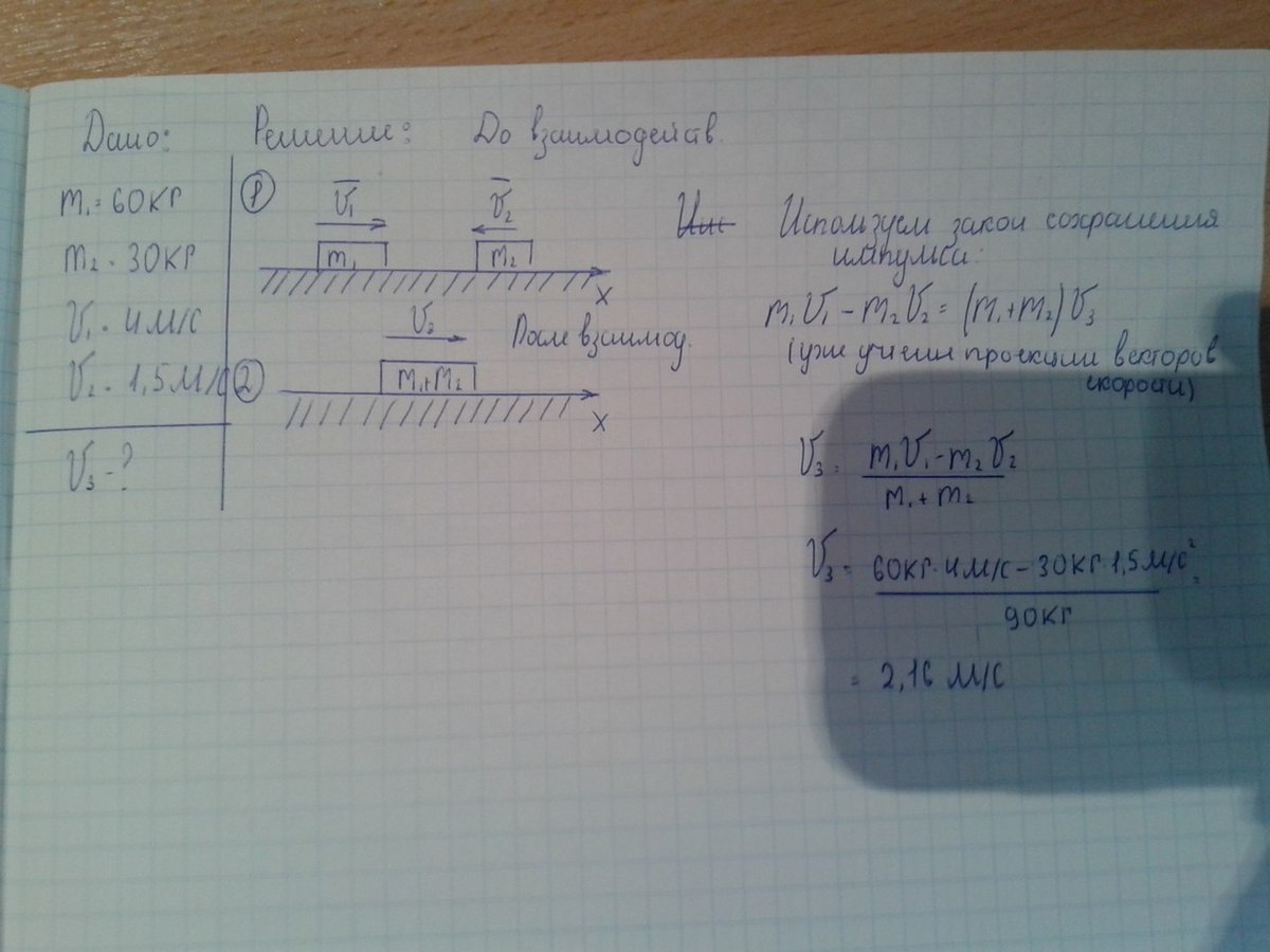 человек бегущий со скоростью 4м/с , вскакивает на тележку движущую ему на встречу со скоростью 1.5 м/с. Какова скорость тележки после этого?Массы человека и тележки соответственно равны 60 и 30 кг.