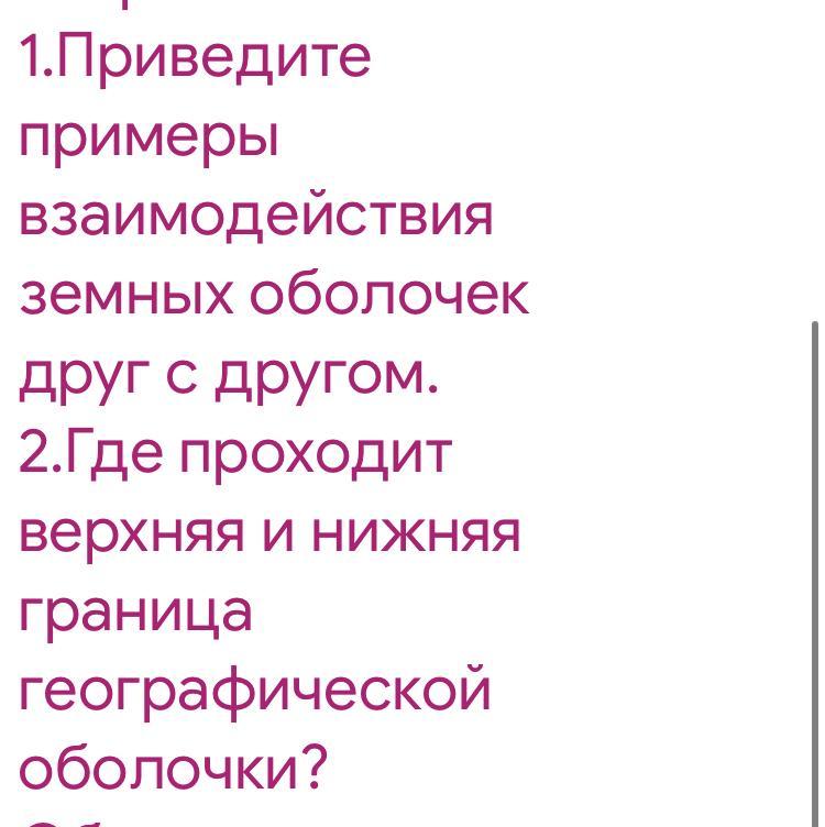 1) Взаимодействие земных оболочек: проникают друг в друга, влияют друг на друга, обмениваются нужными веществами.