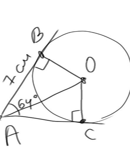 Из точки А к окружности проведены две касательные, точки В и С – точки касания. Угол ВАС равен 64 градуса, АВ=7 см. Найти АС и угол ВАО, где точка О – центр данной окружности.
