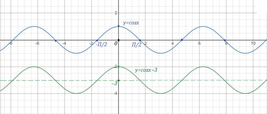 2) Затем сдвинем его вниз вдоль оси ОУ на 3 единицы, получим график функции y=cosx-3 . ( Мы как бы рисуем график у=cosx в новой системе координат, где прямая у= -3 становится как бы новой осью ОХ' , а старая ось ОУ так и остаётся.) .