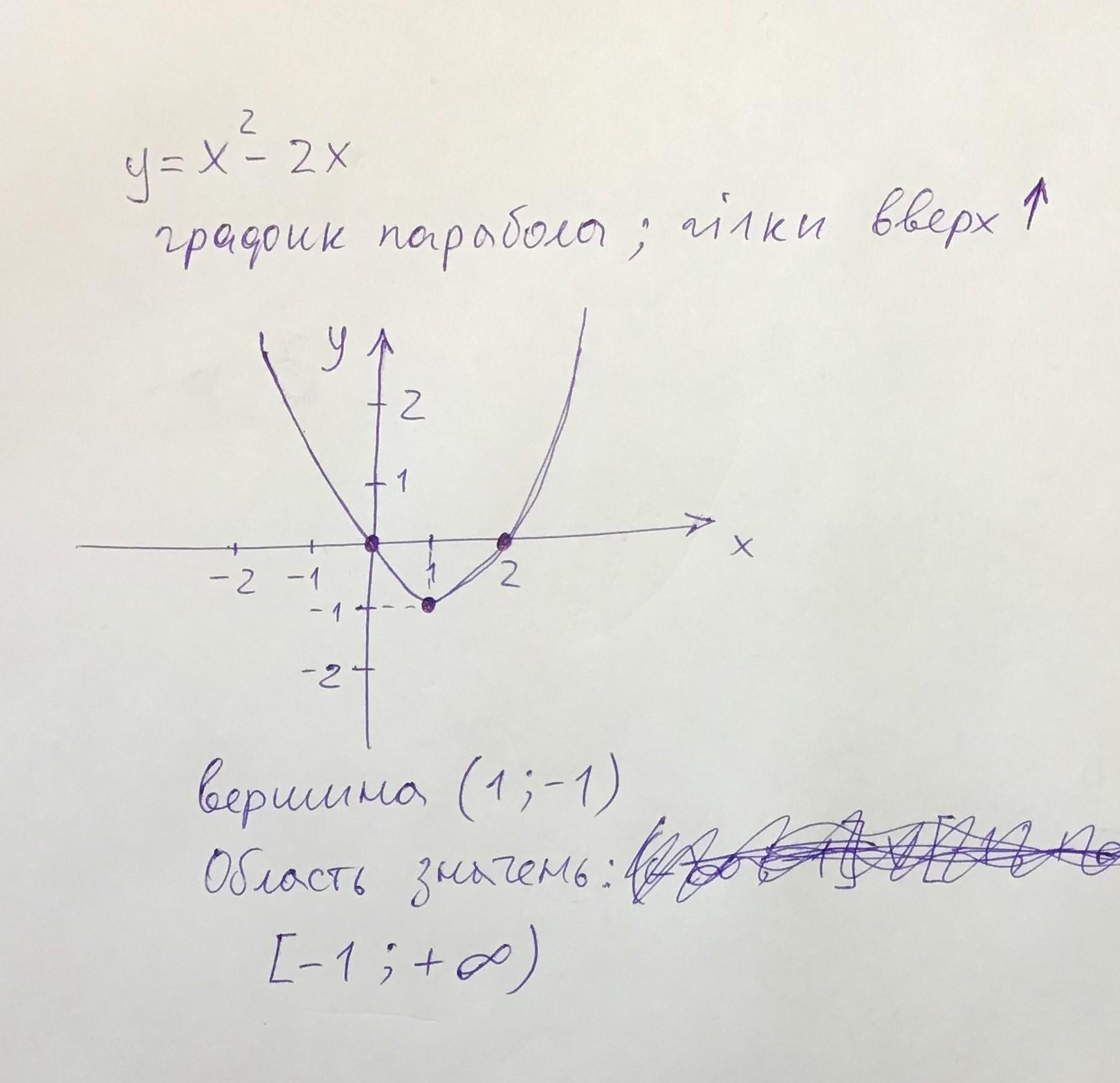 Визначте напрям гілок графіка,знайдіть координати вершин і побудуйте схематично графік функції у=х2-2х. Знайдіть область значень цієї функції.