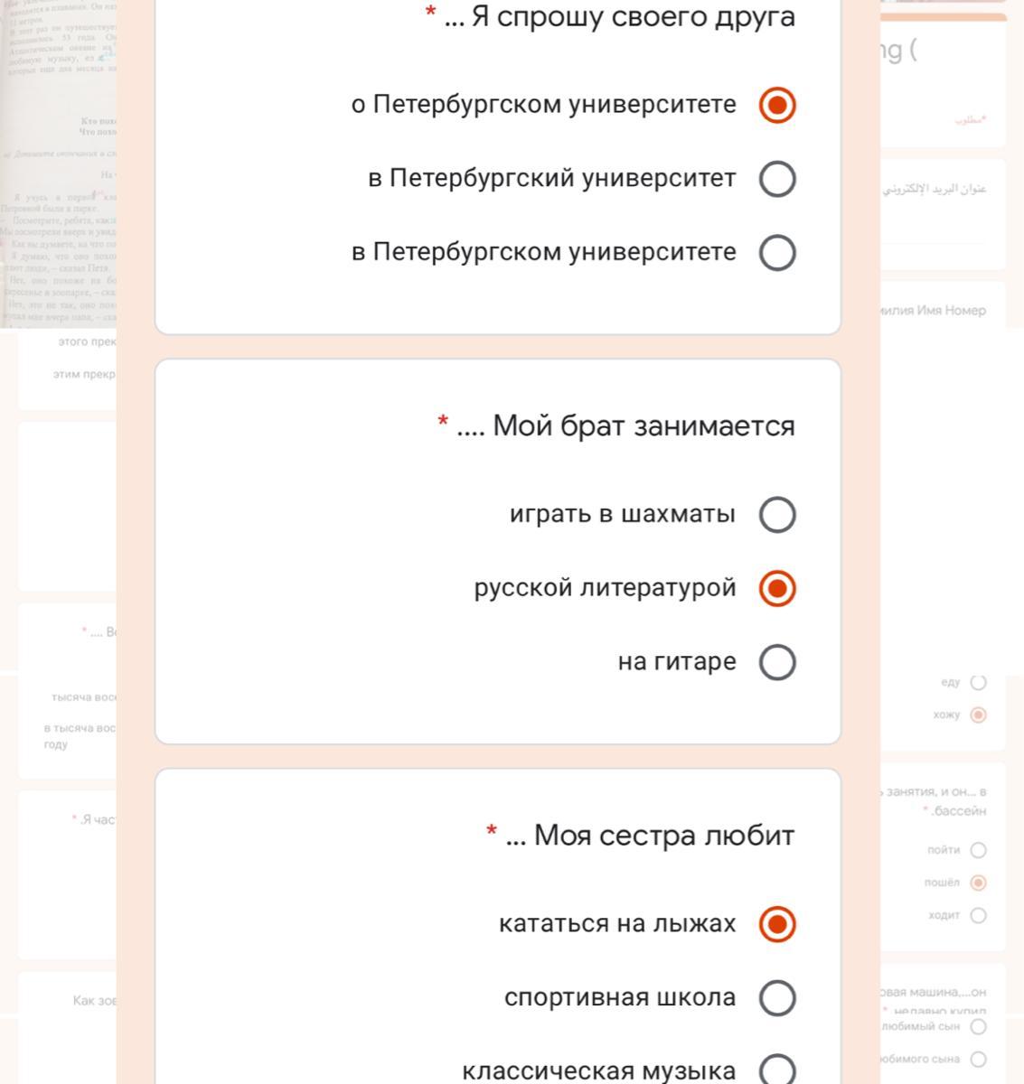 - 1 задание - правильное, ведь не скажешь же: Я спрошу своего друга Петербургском университете. То есть вот это можно сказать, но не очень подходит по смыслу. 2 вариант тоже - нет, значит 1.