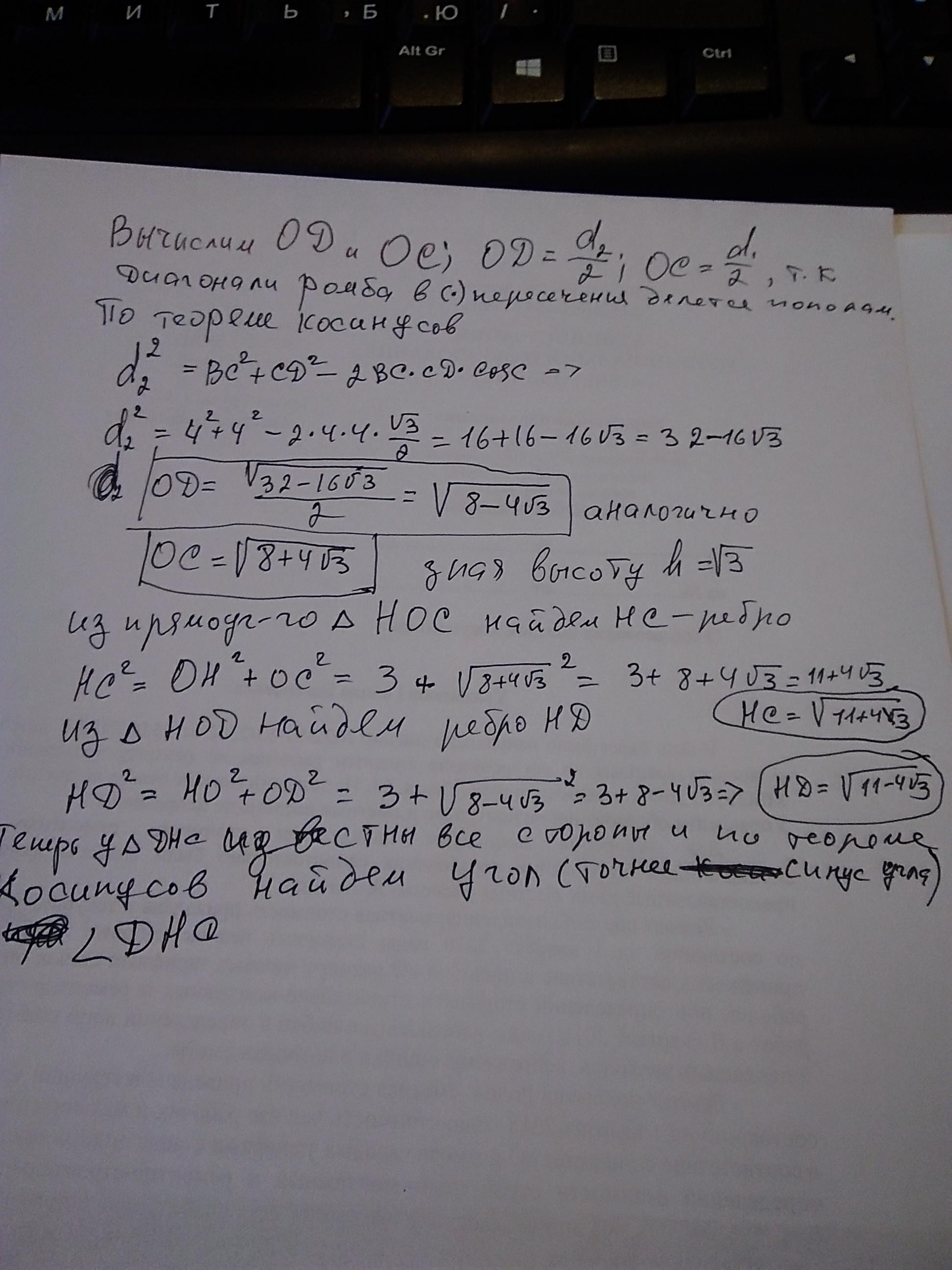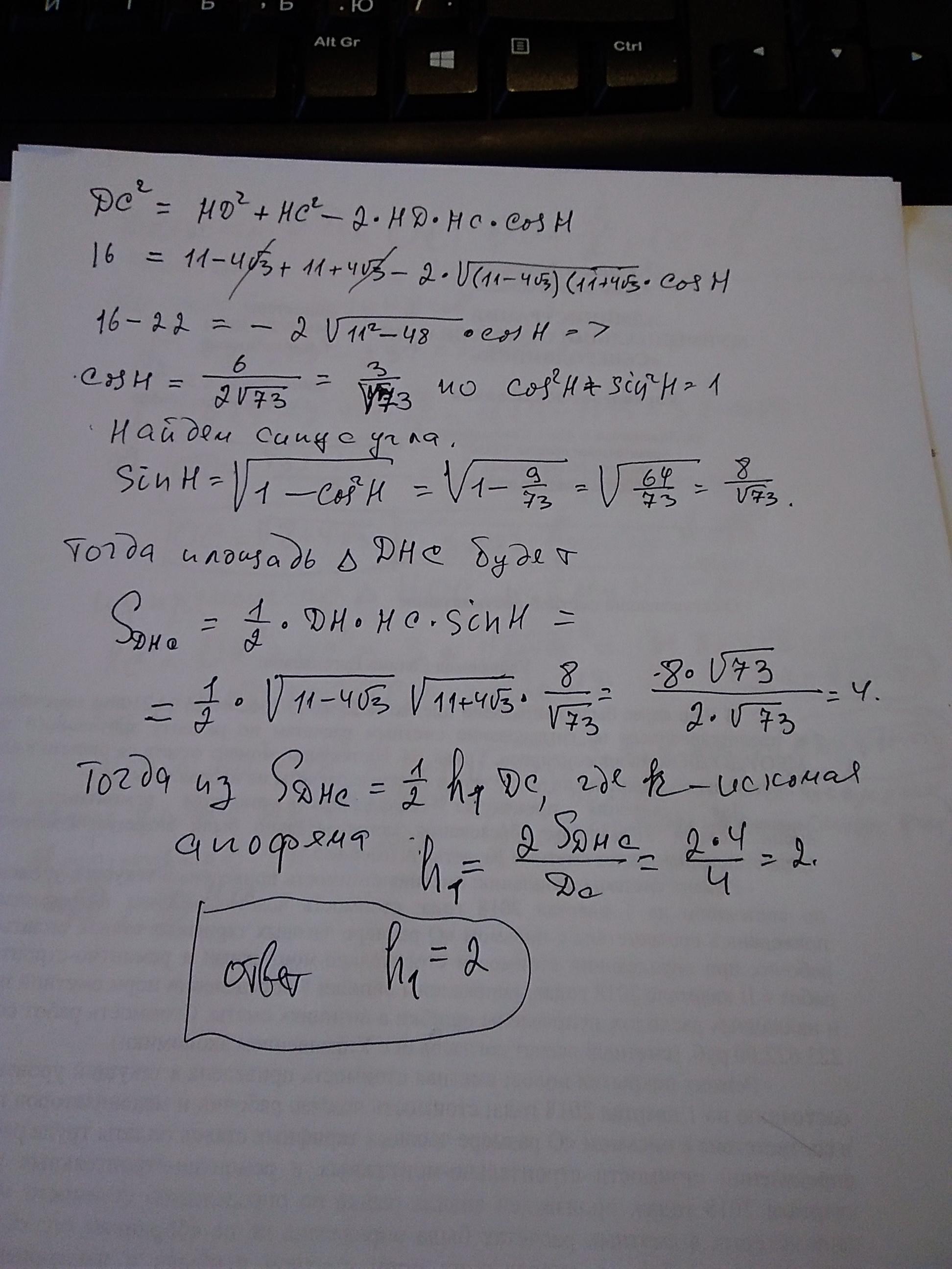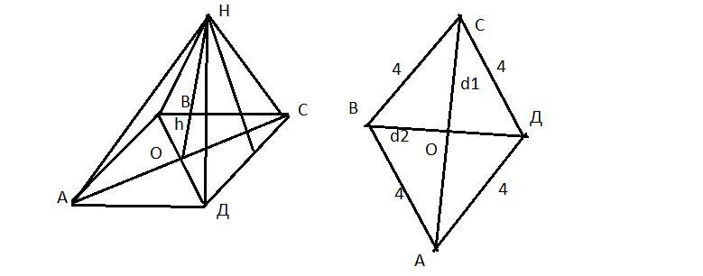 Основанием пирамиды является ромб с острым углом 30 и стороной 4. Найдите апофему пирамиды, если они все равны, а высота пирамиды корень из 3.