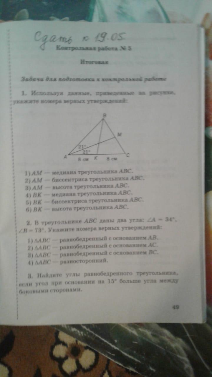 3) Пусть х-угол при верхушке(Сорри забыла как это називаеться, поэтому назову это так)), а х+15-угол при основе(не забываем что этих углов 2). Сумма треугольника=180, тогда