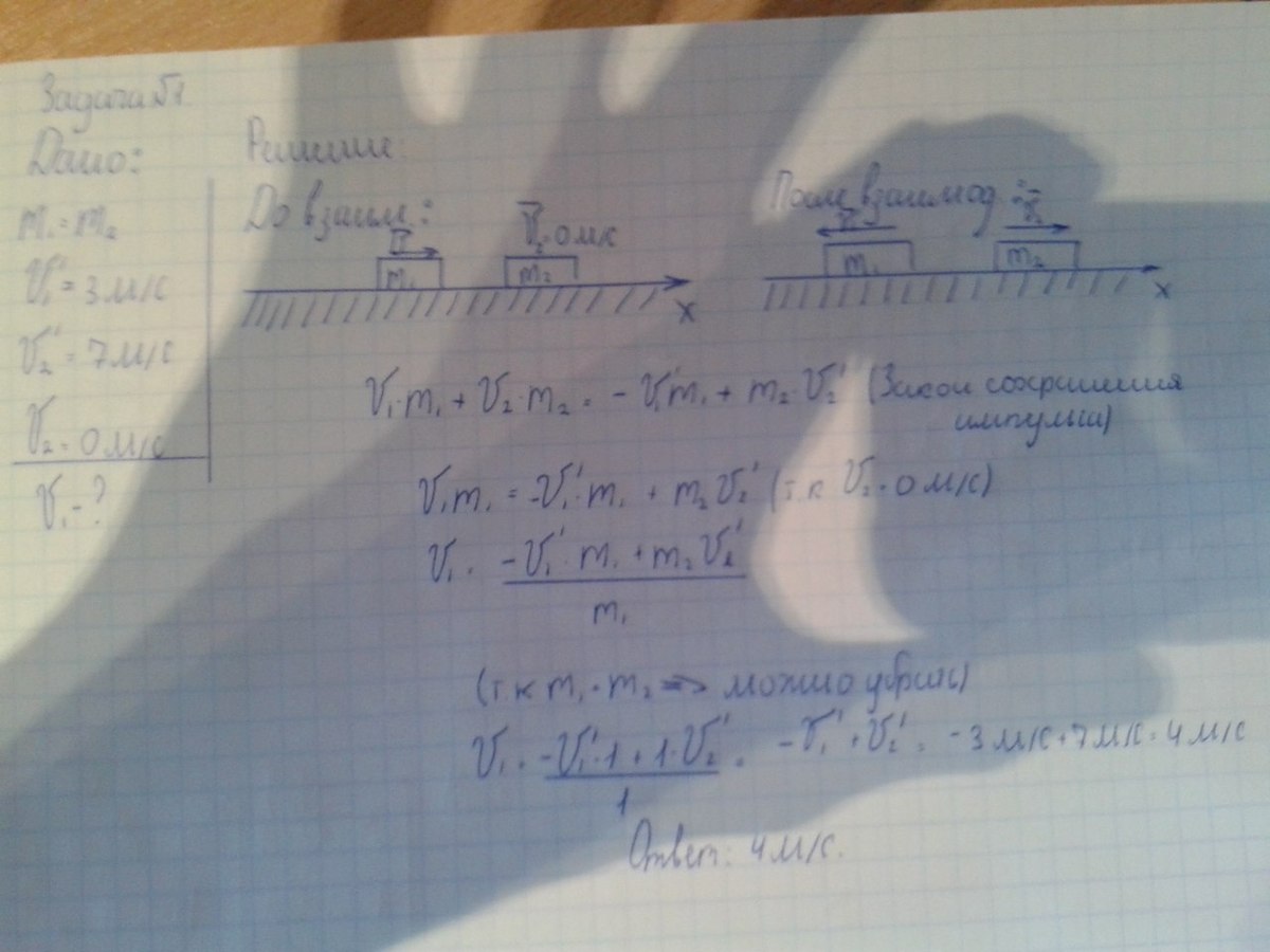 1)Движущееся тело сталкивается с неподвижным телом такой же массы. Найти скорость тела до удара, если после удара оно имеет скорость 3м/с, неподвижное тело приобретает скорость 7м/с, тела движутся в противоположных направлениях