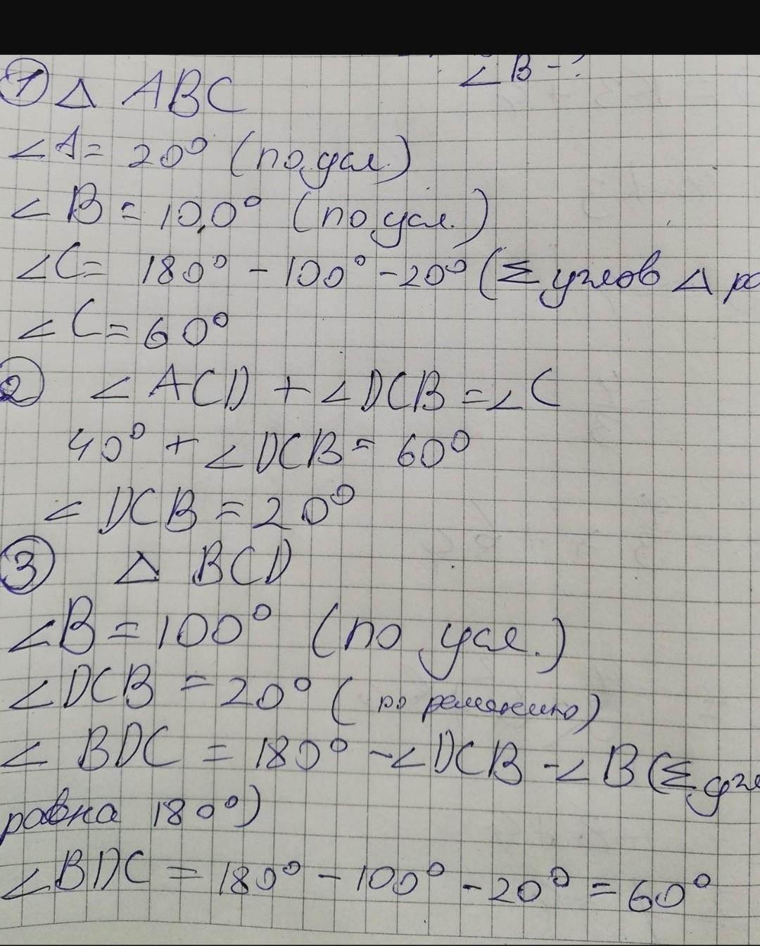 В Треугольнике ABC: Угол A= 20, угол B=100. На стороне AB отмечена точка D так, что угол ACD=40. В Треугольнике BCD найти внешний угол при вершине C.