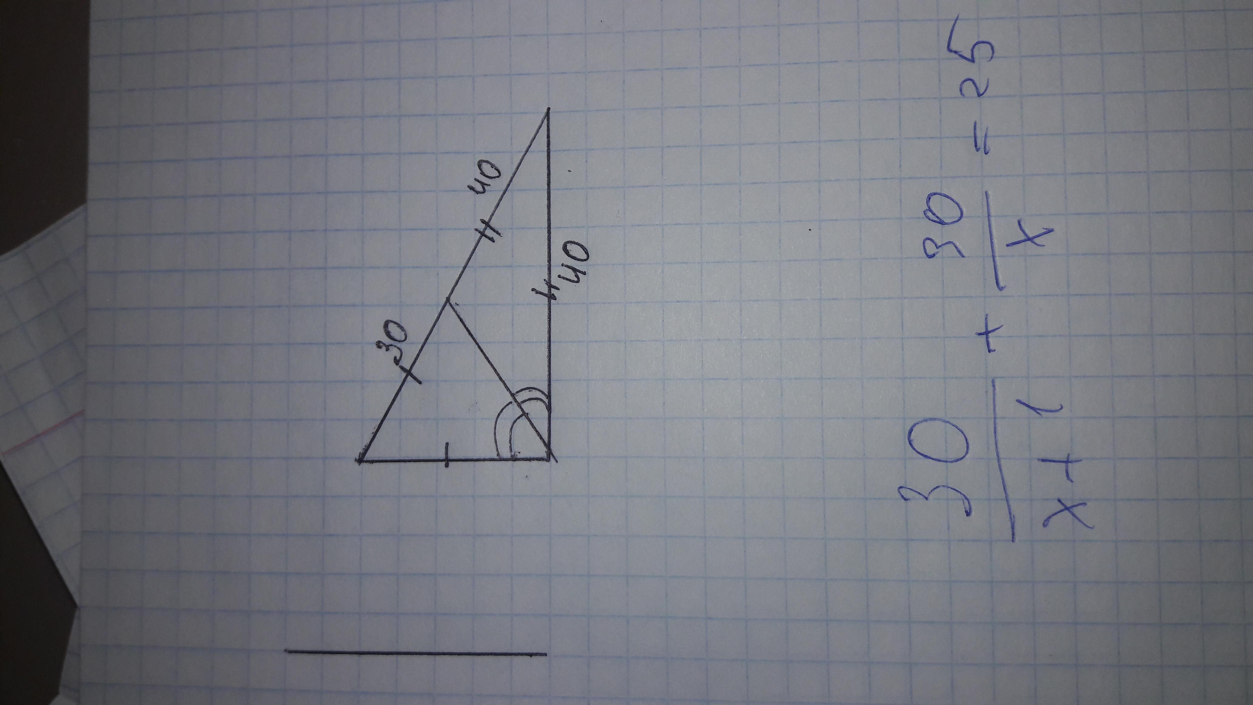 Бісектриса прямого кута прямокутного трикутника ділить гіпотенузу на відрізки 30 і 40 см.Знайдіть менший катет трикутника