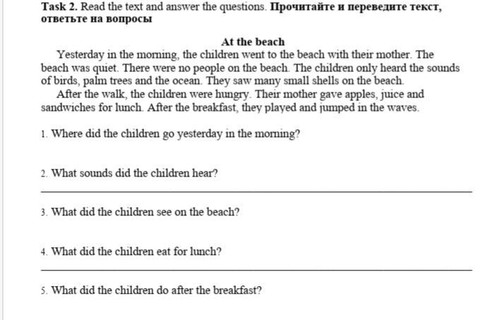 Вчера утром дети пошли на пляж с их мамой. Пляж был тихим. Там не было совсем людей. Дети слышали только звуки птиц,пальм и океана.