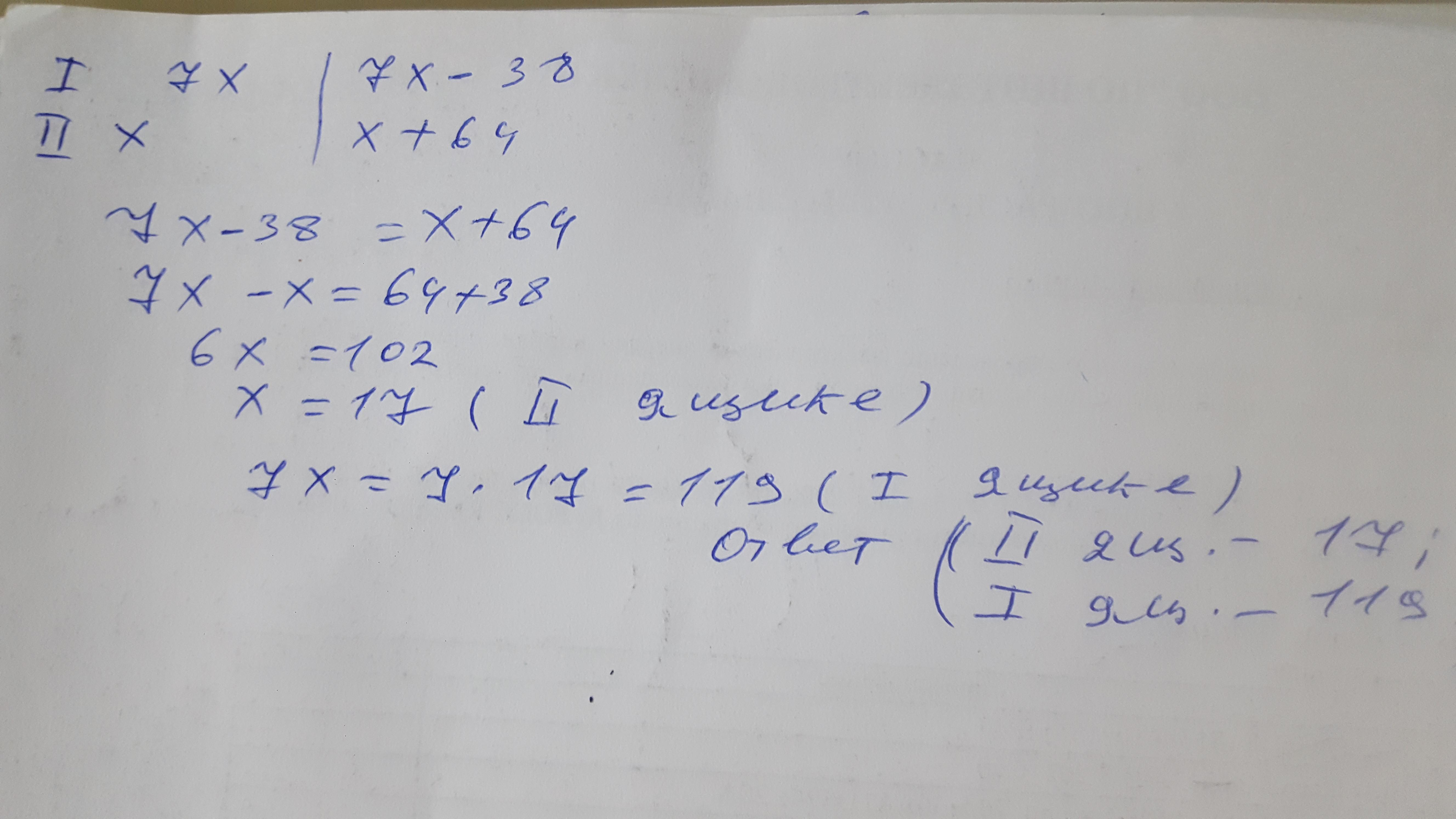 Когда из первого ящика забрали , 38 апельсинов то получили 7х-38,а во второй положили 64,то получили х+64 эти значения стали равными.