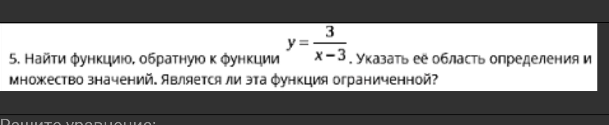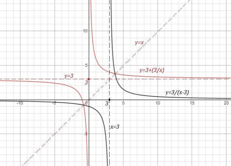 Графиком обратной функции явл. гипербола у=3/х , сдвинутая по оси ОУ на 3 единицы вверх . Эта функция не является ограниченной . Асимптоты - прямые у=3 и х=0 . Графики взаимно обратных функций симметричны относительно прямой у=х .