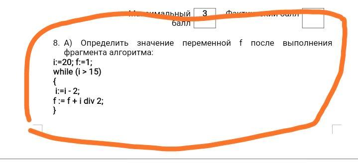 Определить значение переменной f после выполнения фрагмента алгоритма: