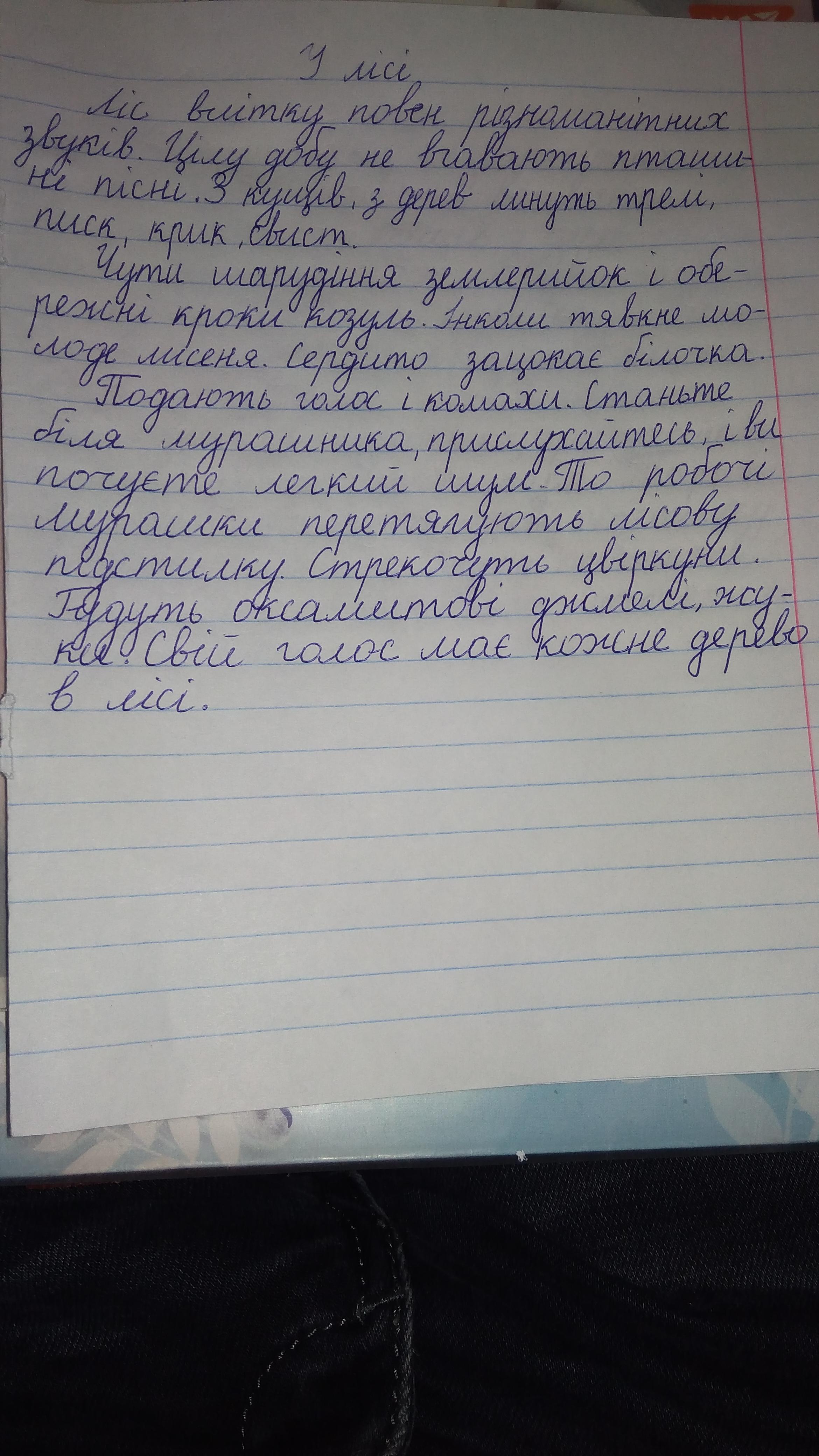 Іменники; ліс пісні трелі писк крик свист лисеня білочка комахи ви мурашки цвіркуни джмелі жуки дерево. Дієслова: не вгавають линуть чути тявкне зацокає подають станьте прислухайтесь почуєте перетягують стрекочуть гудуть має. Прикметники: різноманітних пташині обережні молоде легкий робочі лісову оксамитові кожне