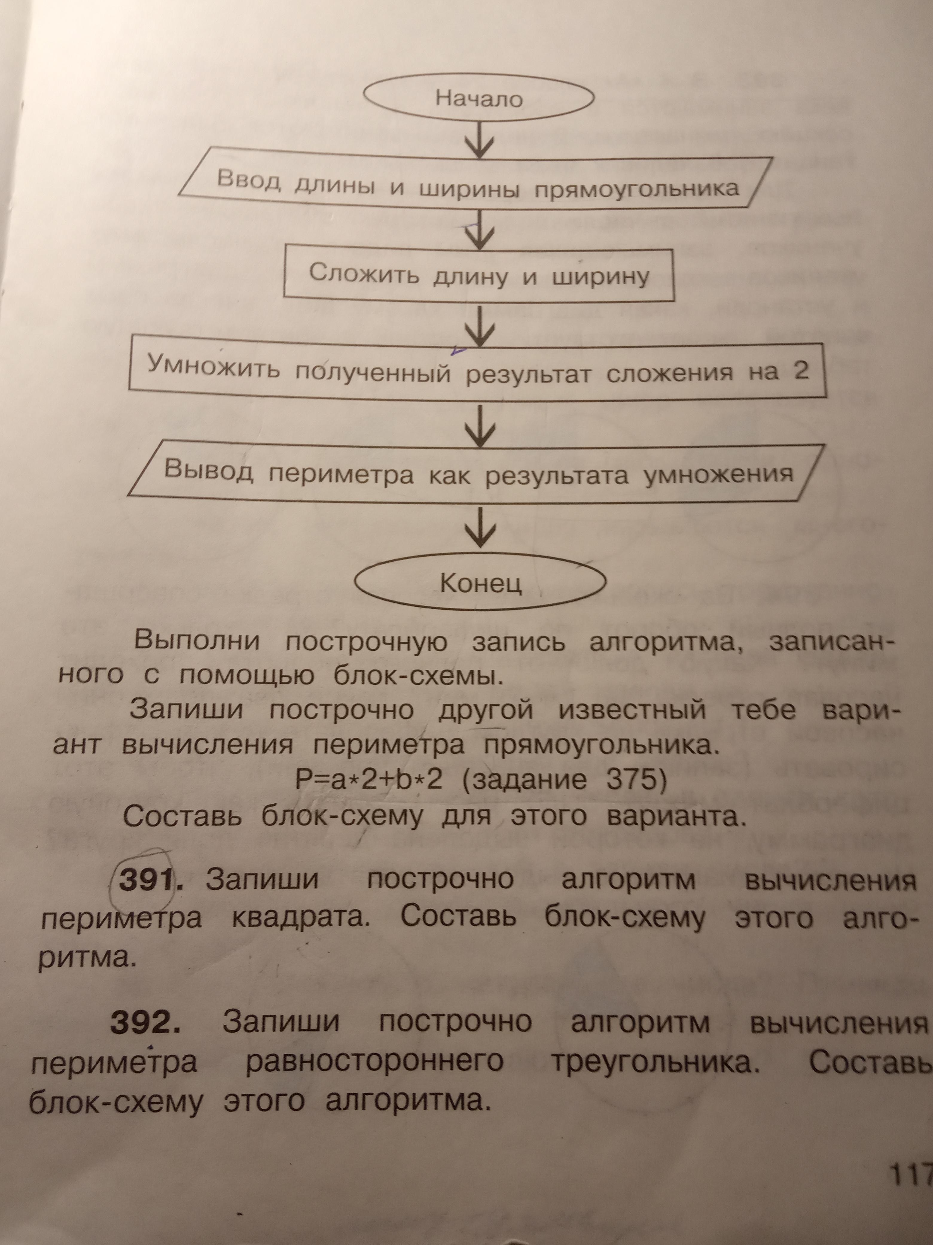 (сложите 2 стороны)-->(умножьте полученный ответ на 2) и блок схема всё что Я написал в квадраты