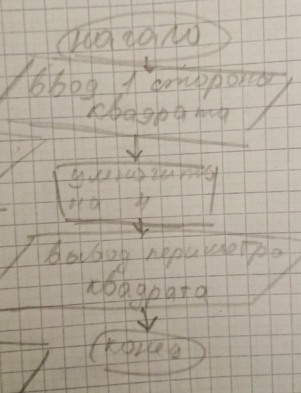 Начало --> ввод одной стороны квадрата --> умножить на 4 --> вывод периметра квадрата --> конец