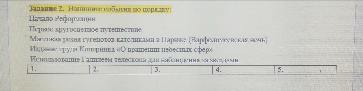 1)Начало Реформации (1517)2)Первое кругосветное путешествие (1519) 3)Издание труда Коперника"О вращение небесных сфер"(1543) 4) Варфоломеевкая ночь (1572)5) Телескоп Галилео Галилея (1609)
