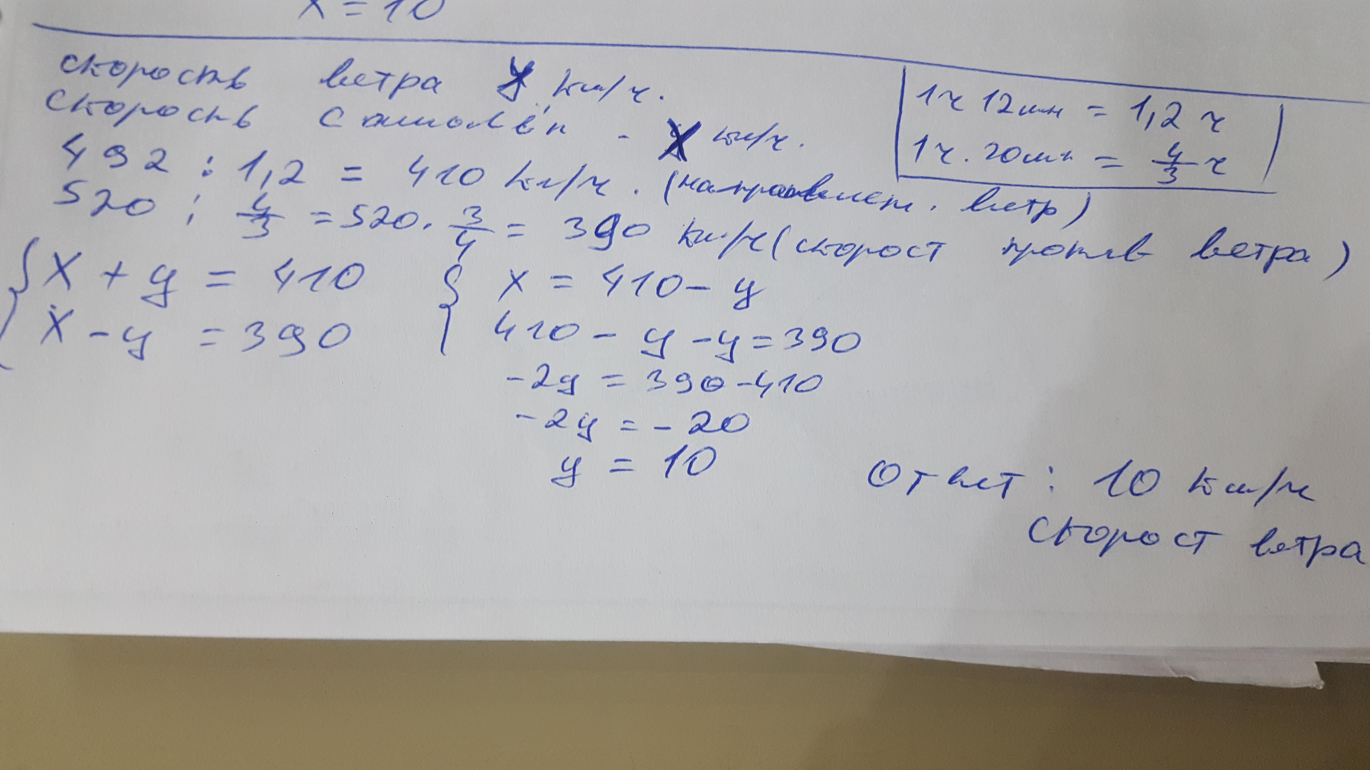 Самолет, летящий по направлению ветра, за 1 час и 12 минут пролетел расстояние 492 км. Против ветра за 1 час и 20 минут он преодолел расстояние в 520 км. Какова скорость ветра?