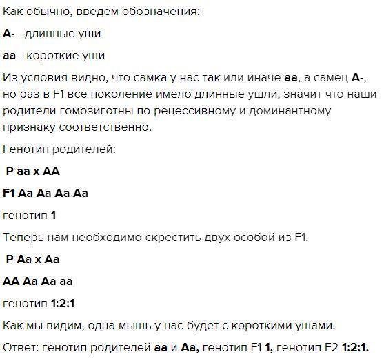 У мышей длинные уши – доминирующий признак, а короткие уши – рецессивный. Скрестили самца с длинными ушами с самкой с короткими ушами. Половина потомства родилось с длинными ушами, а половина с короткими. Определить генотипы родителей и потомства.