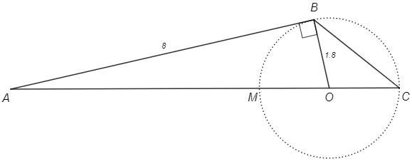 СРОЧНО ПООМООГИТТЕЕЕЕЕЕЕЕ!!!)))))) Окружность с центром на стороне AC треугольника ABC проходит через вершину C и касается прямой AB в точке B. Найдите AC, если диаметр окружности равен 3,6, а AB=8.