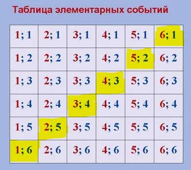 Одновременно подбрасывают два шестигранных игральных кубика. запишите исходы для события " число выпавших очков в сумме равно 7