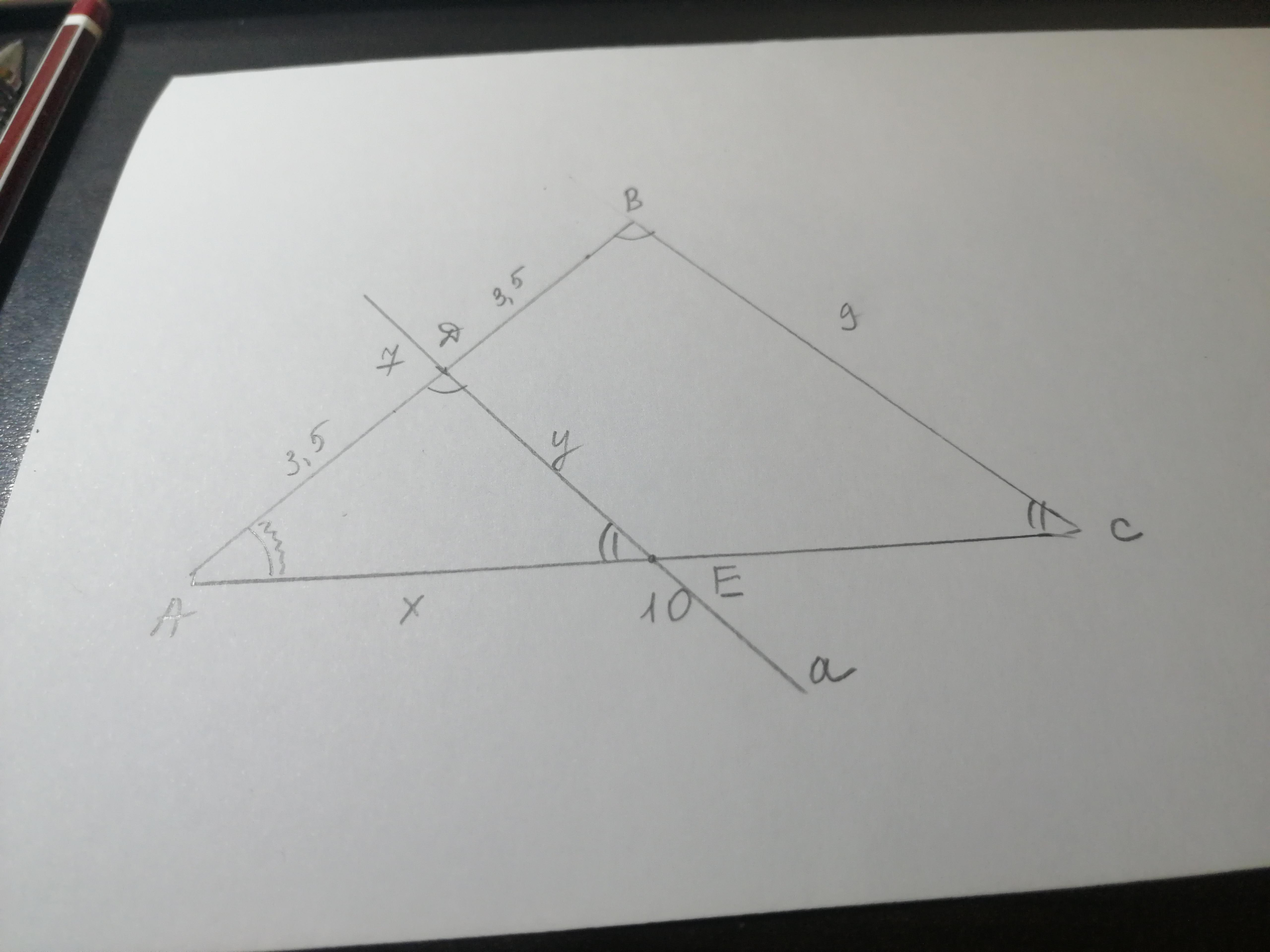 5) Если в двух Δ углы при вершинах одного Δ соответственно равны углам при вершинах другого Δ, то соответственные стороны этих Δ связаны отношением: АВ/АD=АС/АЕ=ВС/DE. Подставляем известные значения: