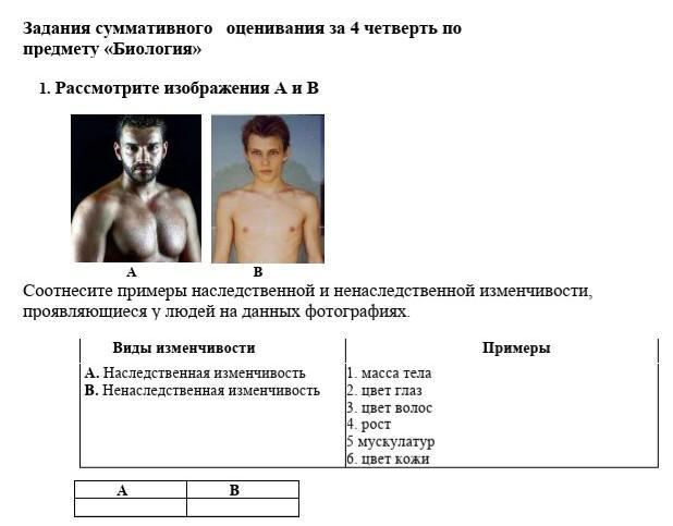 Соотнесите примеры наследственной и ненаследственной изменчивости, проявляющиеся у людей на данных фотографиях.