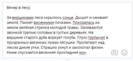 За вершинами леса скрылось солнце. Дышит и оживает земля. Пахнет весенними почками. Показалась из земли зелёная стрелка молодой травы. Заливаются звонкой трелью соловьи в густых деревьях. На вершине старого дуба воркует голубь. Глухо турлычат в прозрачных весенних лужах лягушки. Пролетают над лесом дикие утки.