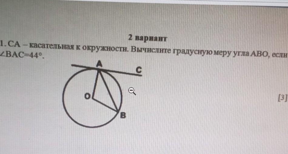СА-касательная , АВ-хорда окружности с центром О, ∠ВАС=44°. Найти ∠АВО.