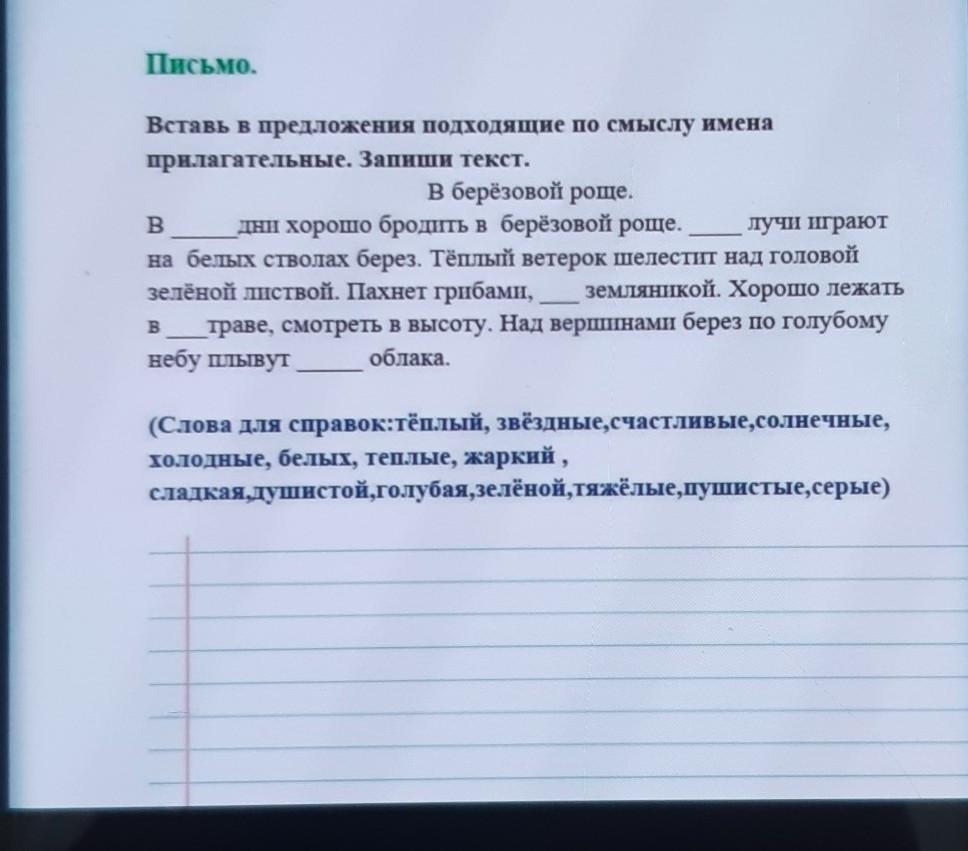 1. Тёплые 2.Солнечные 3.Душистой 4.Зелёной. 5.Пушистые