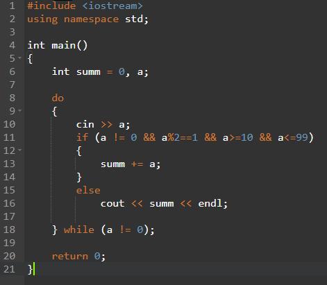 Напишите программу, которая в последовательности целых чисел определяет сумму двузначных нечетных чисел. Программа получает на вход целые числа, количество введенных чисел неизвестно, последовательность чисел заканчивается числом 0 (0-признак окончания ввода, не входит в последовательность).