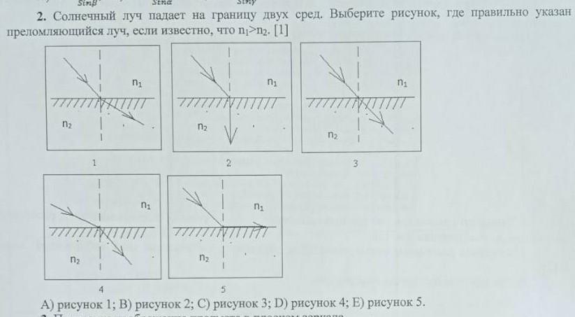 Солнечный луч падает на границу двух сред. Выберите рисунок, где правильно указаны преломляющий луч, если известно что n1>n2