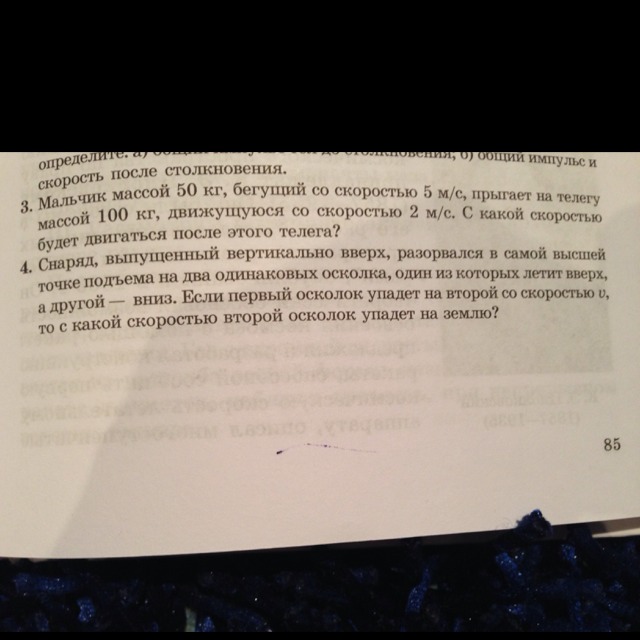 Первый осколок, поднявшись до точки максимального подъема и полетев вниз приобретет ту же скорость что и была у него в момент разрыва , но теперь она направлена вниз . Она совпадает со скоростью второго осколка.