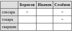 На 5-й, Семёнов старше токаря, значит, он не токарь, при этом слесарь самый младший, значит, Семёнов не может быть и слесарем. У Борисова есть сестра, кроме того, мы знаем, что у слесаря нет ни братьев, ни сестёр, значит, Борисов не слесарь. Из таблицы ясно, что Семёнов — сварщик, а Иванов — слесарь.