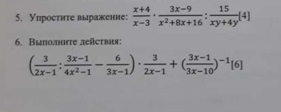 6)\; \; \Big(\dfrac{3}{2x-1}:\dfrac{3x-1}{4x^2-1}-\dfrac{6}{3x-1}\Big)\cdot \dfrac{3}{2x-1}+\Big(\dfrac{3x-1}{3x-10}\Big)^{-1}=\\\\\\=\Big(\dfrac{3}{2x-1}\cdot \dfrac{(2x-1)(2x+1)}{3x-1}-\dfrac{6}{3x-1}\Big)\cdot \dfrac{3}{2x-1}+\dfrac{3x-10}{3x-1}=\\\\\\=\Big(\dfrac{3\, (2x+1)}{3x-1}-\dfrac{6}{3x-1}\Big)\cdot \dfrac{3}{2x-1}+\dfrac{3x-10}{3x-1}=\dfrac{6x+3-6}{3x-1}\cdot \dfrac{3}{2x-1}+\dfrac{3x-10}{3x-1}=\\\\\\=\dfrac{(6x-3)\cdot 3}{(3x-1)(2x-1)}+\dfrac{3x-10}{3x-1}=\dfrac{18x-9+(3x-10)(2x-1)}{3x-1}=
