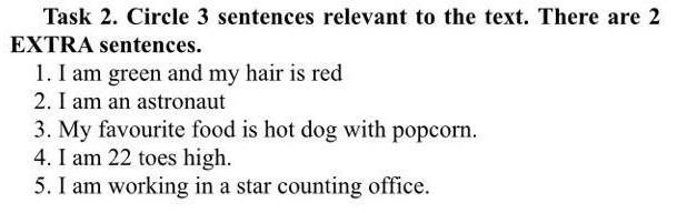 Задание 2. Обведите 3 предложения, относящиеся к тексту. Есть 2 ДОПОЛНИТЕЛЬНЫХ предложения. 1. Я зеленый и мои волосы красные 2. Я астронавт 3. Моя любимая еда - хот-дог с попкормом. 4. У меня 22 пальца. 5. Я работаю в офисе по подсчету звезд.