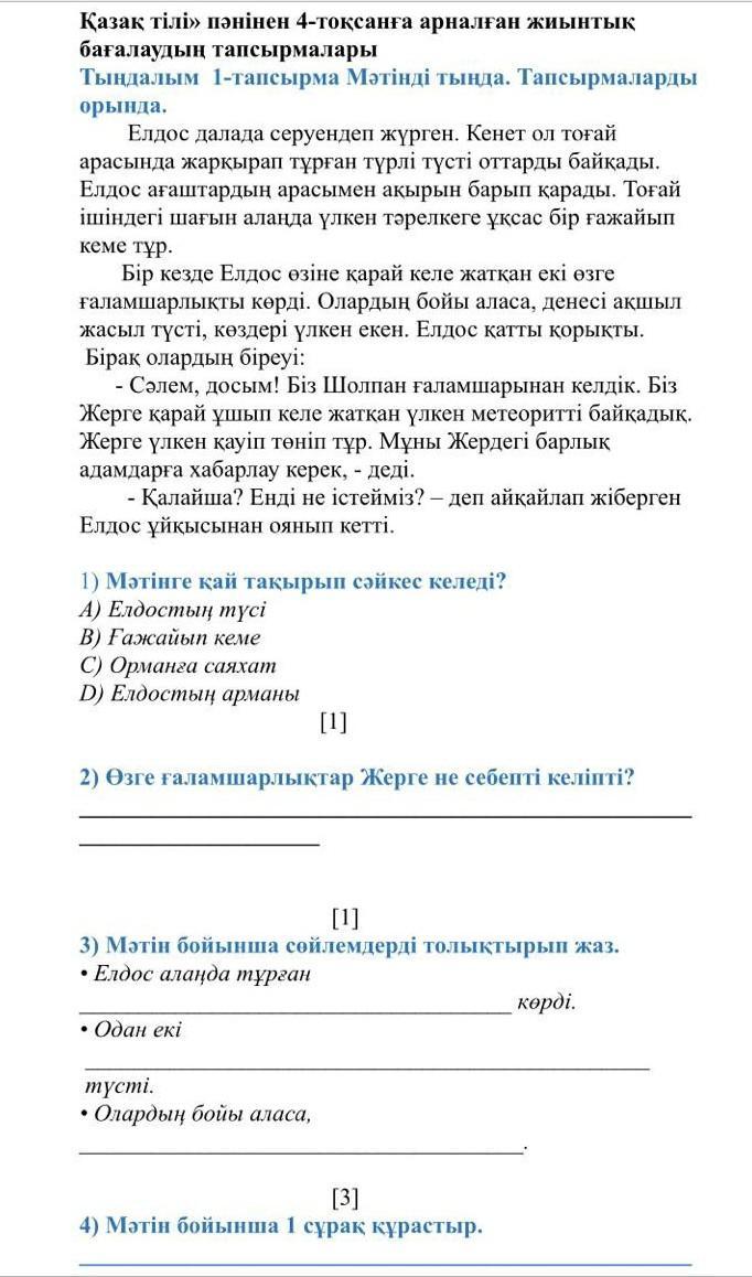 Ответ:1)Елдостың түсі. 2)Жерді метеоридтен құтқару үшін. 3)Елдос алаңда тұрғанүлкен тәрелкені көрді. Одан екі өзге ғаламшарлықтарды көрді. Олардың бойы аласа, денесі ақшыл жасыл түсті, көздері үлкен екен.. 4)Өзге ғаламшарлықтар қай планетадан келді.?