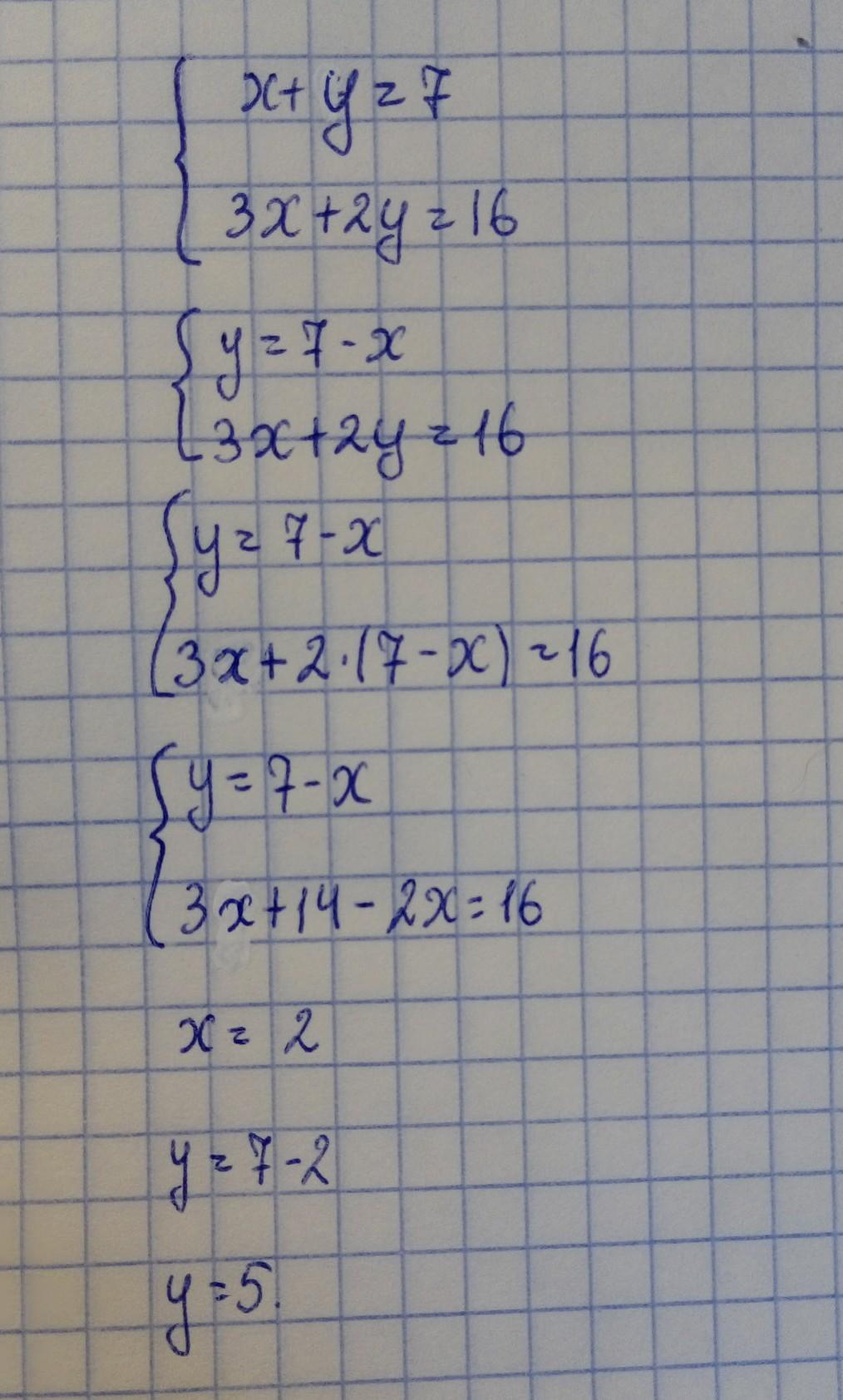 решите систему уравнений способом подстановки: x+y=7 3x+2y=16