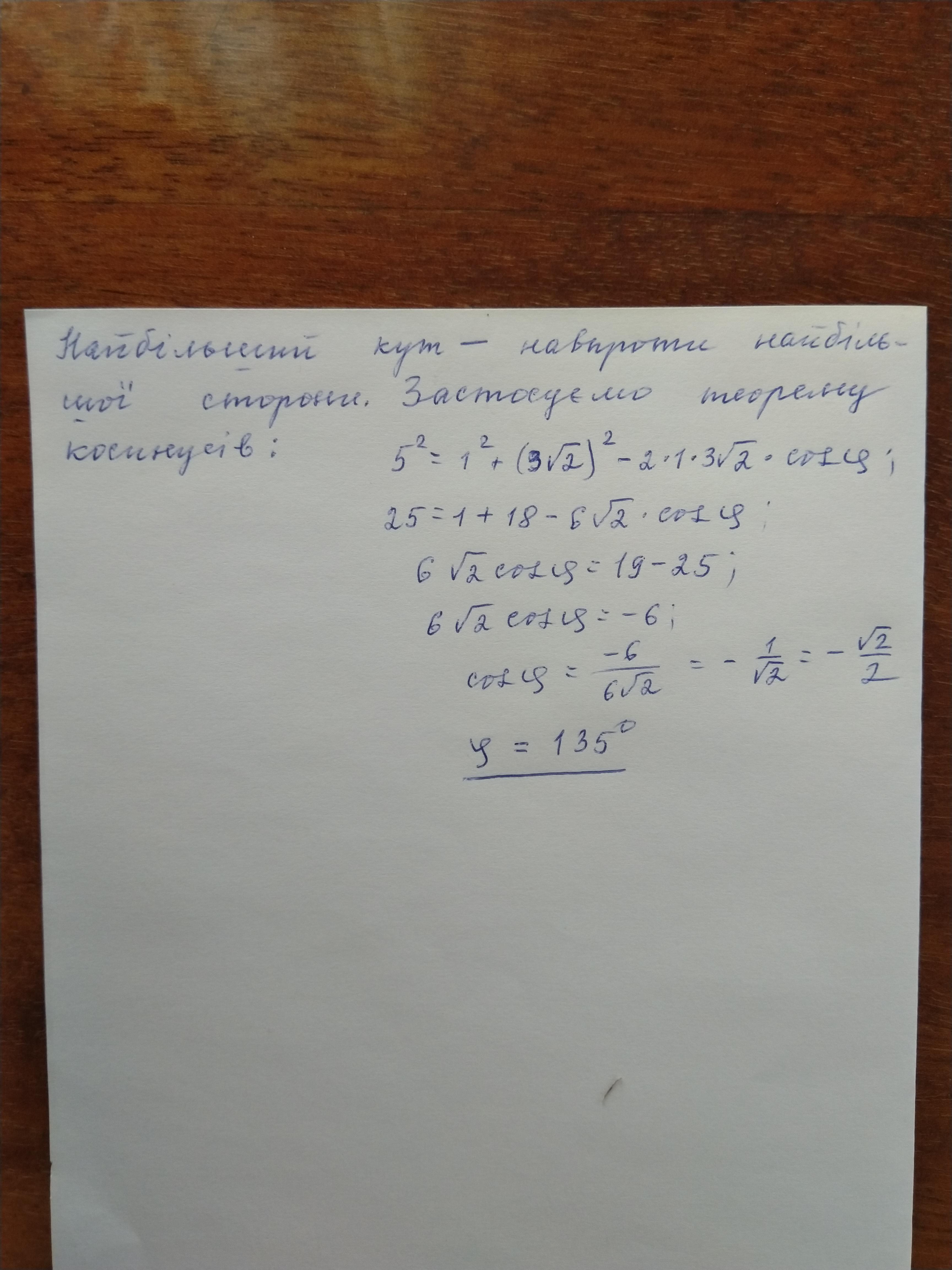 Сторони трикутника дорівнюють 1 см, 3 корень из 2см і 5 см. Знайдіть найбільший кут трикутника.