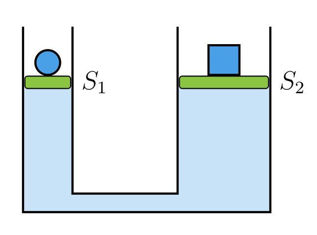 Гидравлический пресс имеет два поршня, площади которых см S1=50 см2 и см S2=150 см2. На больший поршень поставлен куб массой кг 36 кг. Определить массу шарика на другом поршне. Ответ выразить в кг, округлив до целых.