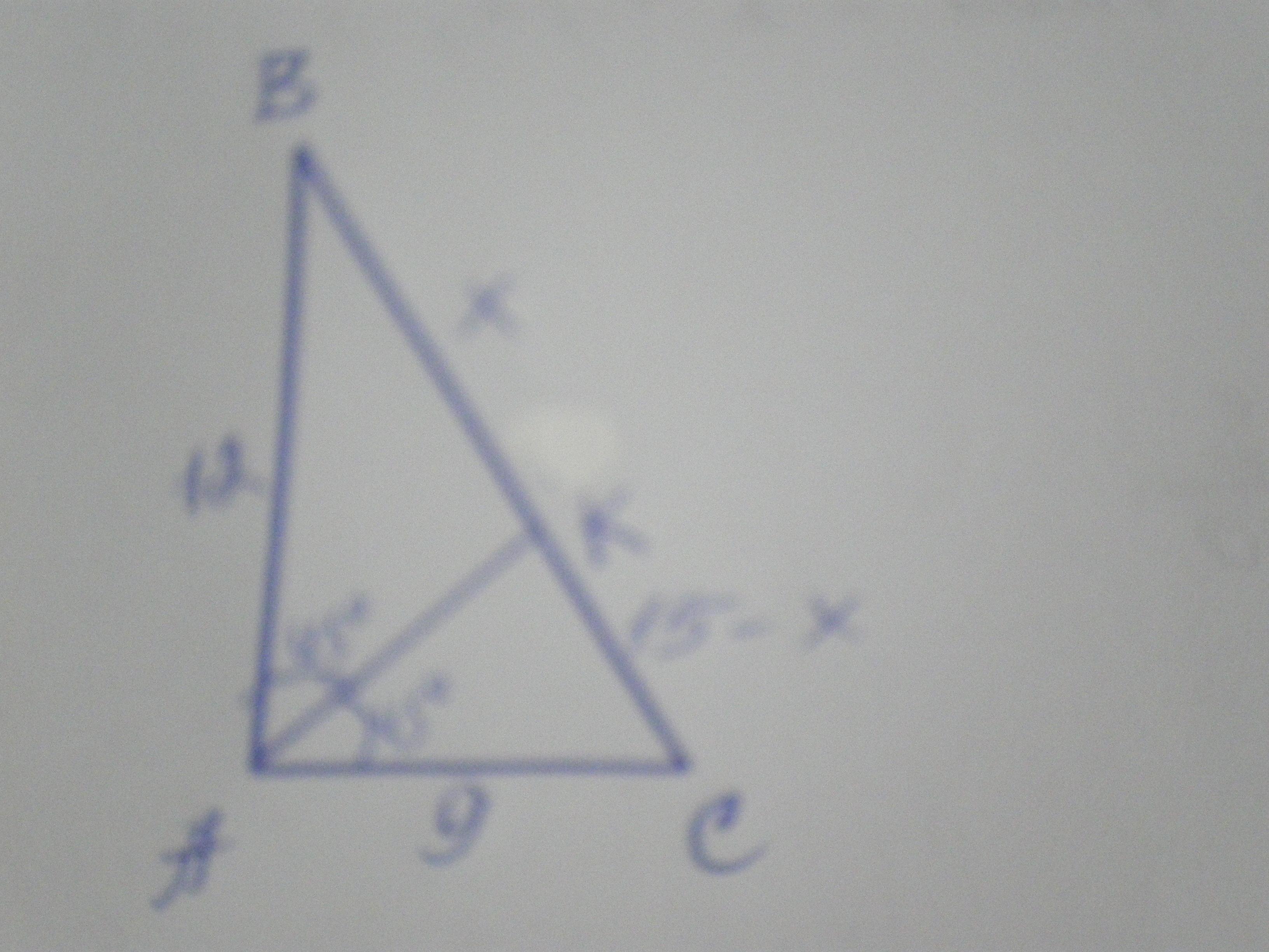 У трикутнику ABC AB=12см,BC=15см кут A прямий.Знайдіть відрізки,на які бісектриса кута A ділить сторону BC