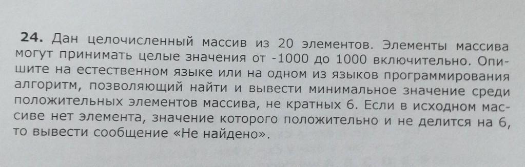Дан целочисленный массив из 20 элементов. Элементы массива могут принимать целые значения от -1000 до 1000. Опишите на естественном языке или на одном из языков программирования алгоритм, позволяющий найти и вывести минимальные значение среди положительных элементов массива, не кратных 6. Если в исходном массиве не элемента, значение которого положительно и не делится на 6, то вывести сообщение "Не найдено"