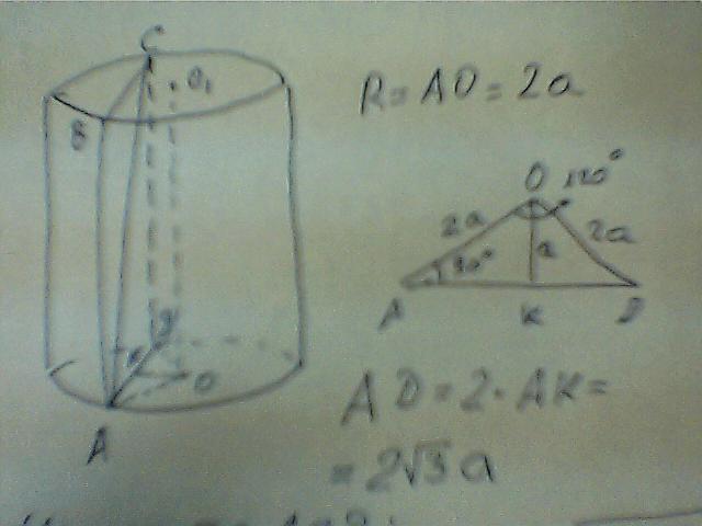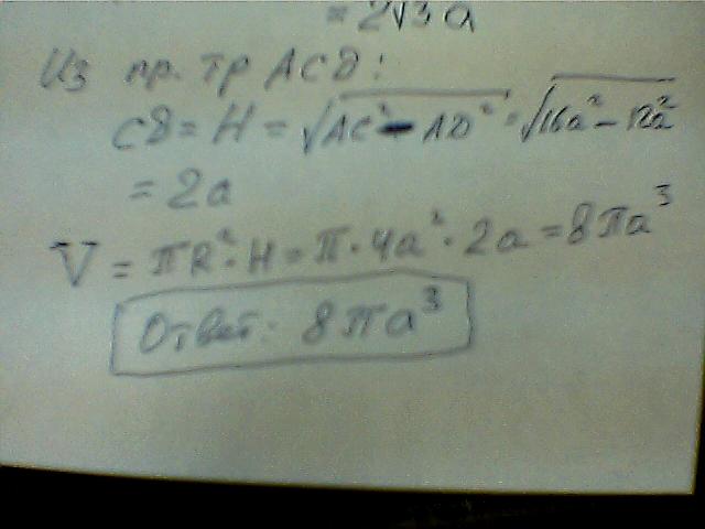 Плоскость, параллельная оси цилиндра, отсекает от окружности основания дугу в 120 градусов и удалена от оси на расстояние равное a. Диагональ в получившемся сечении равна 4a. найдите объём цилиндра