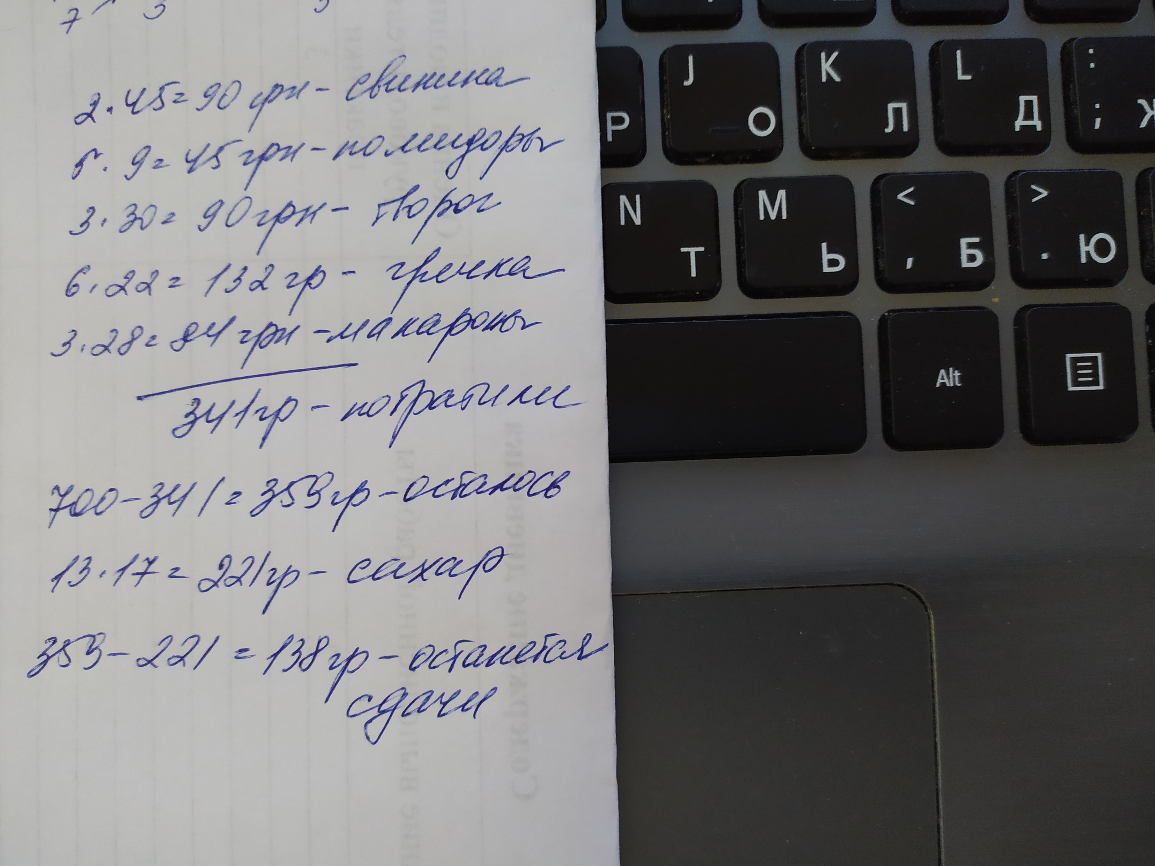 У вас є 700 грн. Ви пішли на ринок-купити продукти. Ви купили: 2 кг свинини по ціні 45 грн , 5 кг помідорів по ціні 9 грн, 3 кг свіжого сиру ціною 30 грн за 1 кг, 6 кг гречки ціною 22 грн за 1 кг, 3 кг макаронів ціною 28 грн за 1 кг і вам потрібно купити ще 17 кг цукру ціною 13 грн за 1 кг. Чи вистачить вам коштів на покупку цукру? ДАМ 20 БАЛЛОВ СРОЧНО!