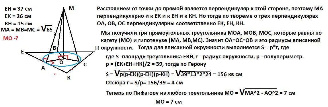 Точка M рівновіддалена на відстань √65 см від усіх сторін трикутника зі сторонами 15 см 26 см і 37 см. Знайдіть відстань від точки M до площини трикутника