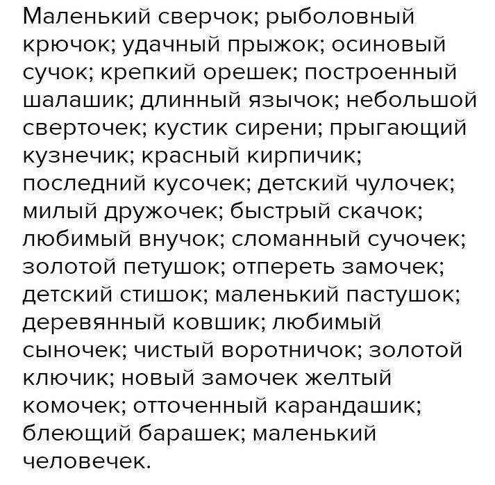 Маленький сверч…к; рыболовный крюч…к; удачный прыж…к; осиновый суч…к; крепкий ореш…к; построенный шалаш…к; длинный языч…к; небольшой сверточ…к; куст…к сирени; прыгающий кузнеч…к; красный кирпич…к; последний кусоч…к; детский чулоч…к; милый дружоч…к; быстрый скач…к; любимый внуч…к; сломанный сучоч…к; золотой петуш…к; отпереть замоч…к; детский стиш…к; маленький пастуш…к; деревянный ковш…к; любимый сыноч…к; чистый воротнич…к; золотой ключ…к; новый замоч…к желтый комоч…к; отточенный карандаш…к; блеющий бараш…к; маленький человеч…к.