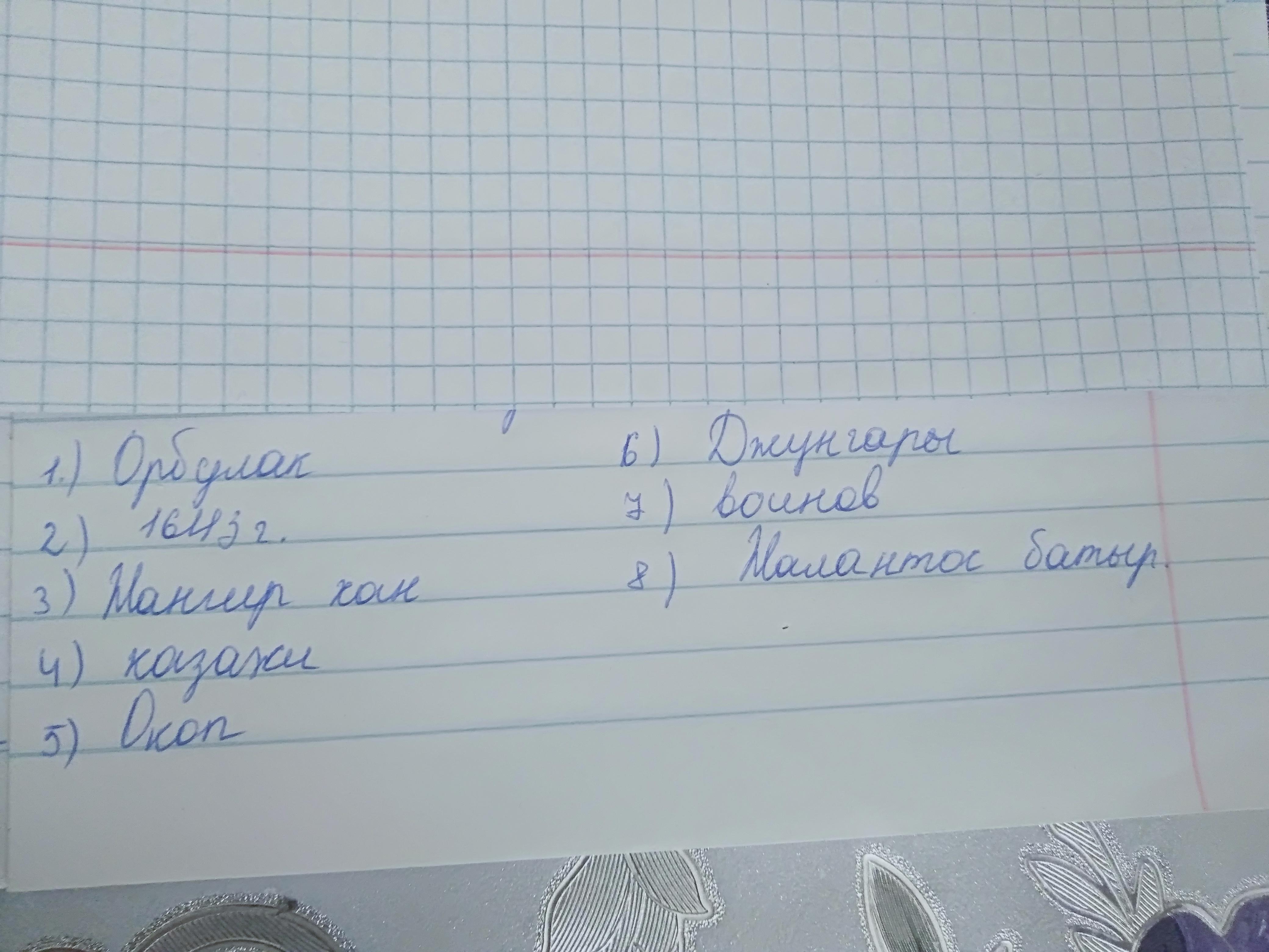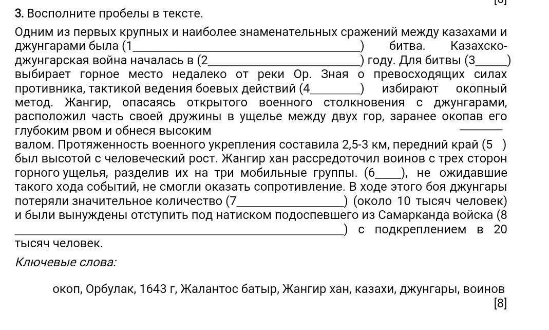 Одним из первых крупных и наиболее знаменательных сражений между казахами и джунгарами была (1 ) битва. Казахско-джунгарская война началась в (2 ) году. Для битвы (3 ) выбирает горное место недалеко от реки Ор. Зная о превосходящих силах противника, тактикой ведения боевых действий (4 ) избирают окопный метод. Жангир, опасаясь открытого военного столкновения с джунгарами, расположил часть своей дружины в ущелье между двух гор, заранее окопав его глубоким рвом и обнеся высоким
